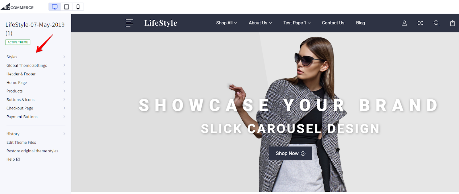 Once you’ve installed/applied your theme, it’s time to personalize and make it your own. While all of your products, categories, pages, and marketing (including the slideshow) will be configured from BigCommerce dashboard, most of the changes you make for the look & feel of the store will take place from the store design.
